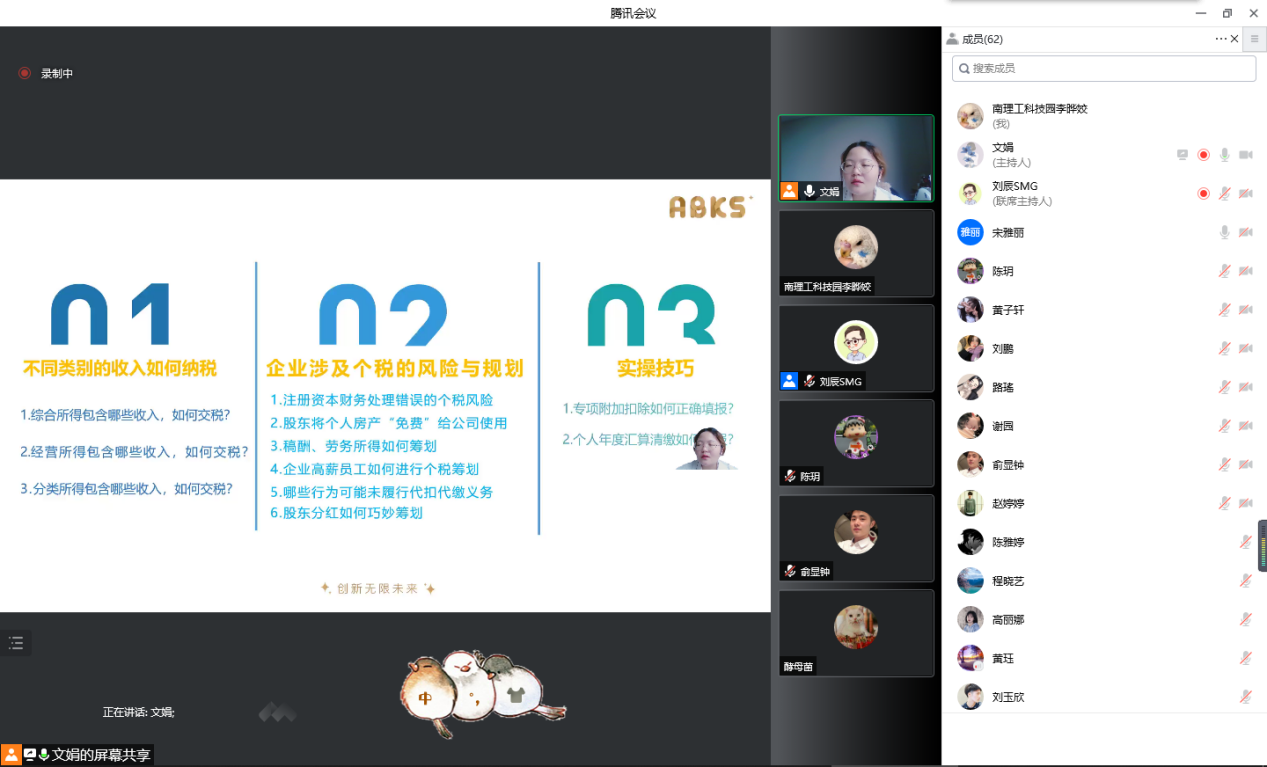 5月26日下午,2022年第二期财税专项系列培训会顺利举办,本次讲座由秦淮区科技局、秦淮区物联网产业生态联盟、南京理工大学国家大学科技园、二月兰·创新工坊联合主办,南京安博克斯信息科技有限公司承办。本讲座采取线上的方式,主题为:“个人所得税涉税风险与实操技巧”,特邀AAIA国际会计师全权会员文秀娟女士主讲。共计60余人陆续参加了此次线上培训会。