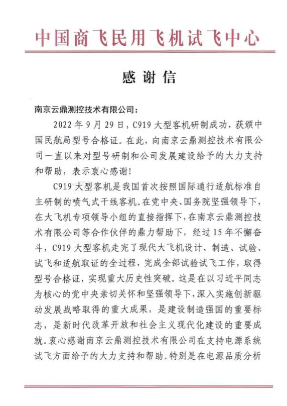 C919大型客机是我国首次按照国际通行适航标准自主研制的喷气式干线客机。2022年9月29日,中国商飞的C919大型客机研制成功,获颁中国民航局型号合格证,实现重大历史性突破。中国商飞衷心感谢南京云鼎测控技术有限公司在支持电源系统试飞方面给予的大力支持和帮助,特别是在电源品质分析工作等方面付出了艰辛努力,作出了重要贡献。