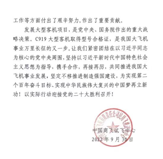 祝贺我园企业南京云鼎测控技术有限公司在C919大型客机研制项目上获中国商飞民用飞机试飞中心(以下简称中国商飞)于2022年9月30日发来的感谢信。